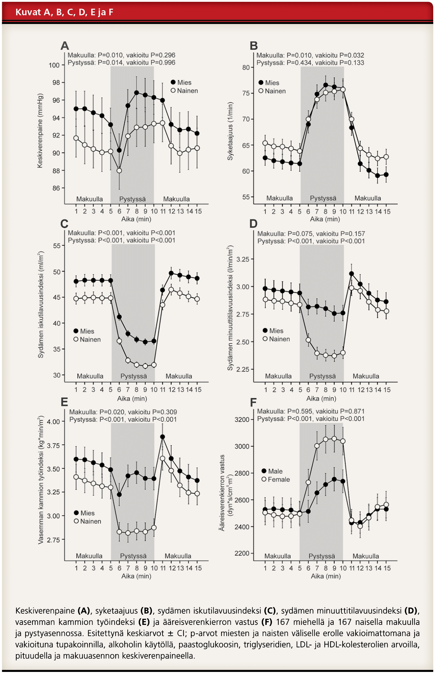 Pystyasennon hemodynamiikan mittauksissa miehillä oli naisia korkeampi keskiverenpaine, iskutilavuus, minuuttitilavuus, vasemman kammion työindeksi (Kuvat A, C, D ja E) ja matalampi ääreisverenkierron vastus (Kuva F). Kun tulokset vakioitiin, keskiverenpainetta lukuun ottamatta kaikki miesten ja naisten väliset erot säilyivät tilastollisesti merkitsevinä.